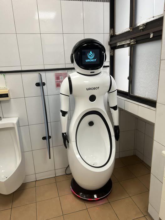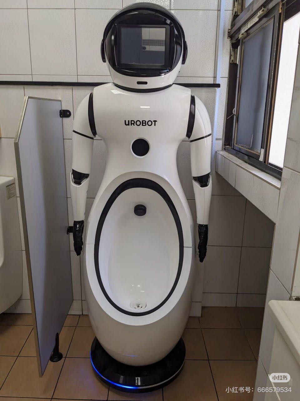 写真は、男性用トイレの通常の小便器の横に設置されたUrobotです。この装置は擬人化されたロボットのような形をしており、本体にはロゴ画面があり、底部には小便器が組み込まれています。